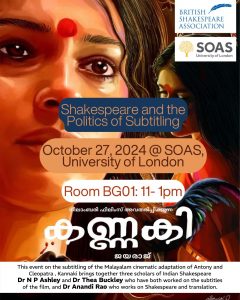 On 27 October 2024 ‘Shakespeare and the Politics of Subtitling’, a BSA Small Grants-funded event, took place at SOAS. The event brought together three Indian Shakespeares scholars: Dr Anandi Rao (SOAS) who works on Shakespeare and translation, and Drs N. P. Ashley (St Stephen’s College, U of Delhi) and Thea Buckley (QUB), who have both worked on the English subtitles of Kannaki, the film under discussion. An adaptation of William Shakespeare’s play Antony and Cleopatra, Kannaki is a 2002 Indian National Award-winning Malayalam-language tragedy written by Sanjeev Kilikulam and directed by Jayaraj R. Nair, who also participated online at this event as Guest Speaker.